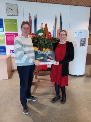 Schülerinnen und Schüler der KWS können sich auch im kommenden Jahr 2026 wieder über den Schulkalender „Wilde Welten“ in ihren Klassenzimmern freuen. Saskia Scharf, Sonderschullehrerin an der KWS erhielt einen Stapel der aktuellen Kalender von Nina Kaufmann, 2. Vorsitzende des Angelsportverein Ketsch und dessen Jugendwart Michael Kaufmann.