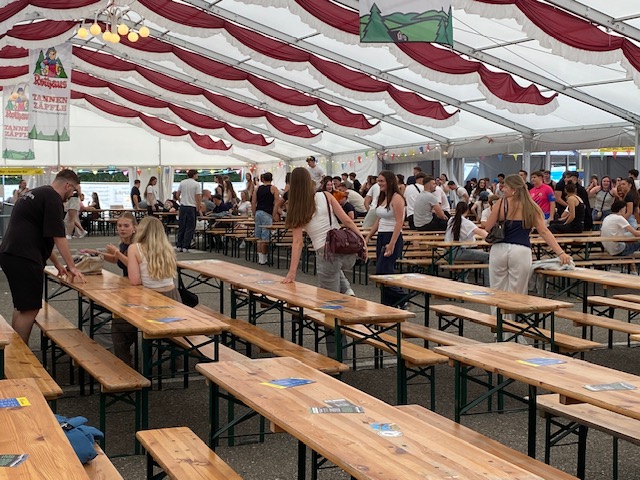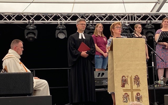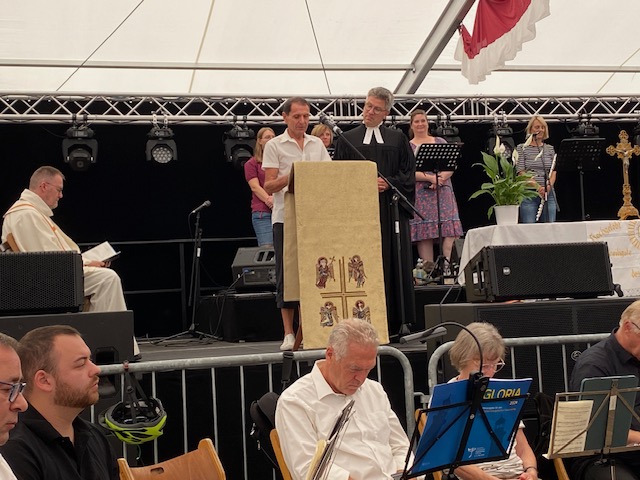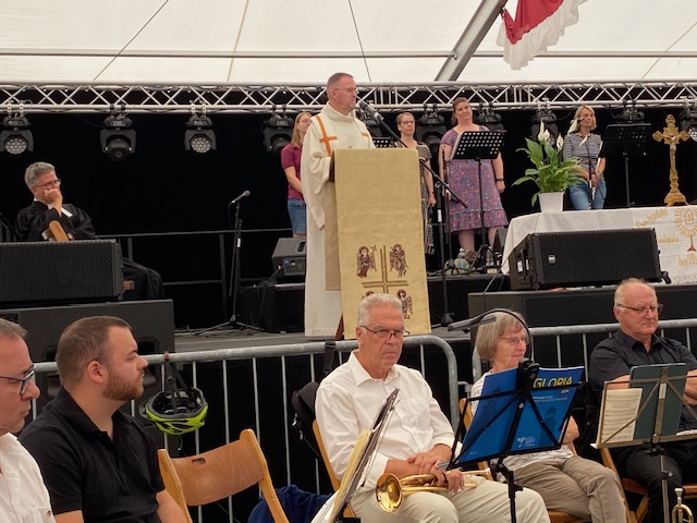 "Ökumenischer Gottesdienst" im Festzelt mit den Seelsorgern Pfarrer Steffen Groß (ev.) und Uwe Lüttinger (kath.).